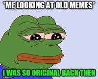 Les mèmes proposés par le personnage de « pépé » utilisent le même format dans la plupart des cas, comme celui de cette image, où le visage triste de « pépé » est accompagné de deux phrases: ce à quoi il pense au-dessus et ce qu'il dit en-dessous du visage.