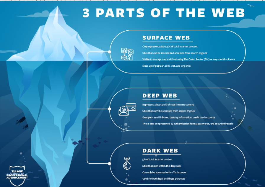 complètement anonyme qui permet la consultation du dark web. Internet comme on le connaît (Google et les sites www.) ne sont en fait que 4-10 % de l’entièreté de l’Internet. En effet, 90-96% de l’internet nous est inaccessible (intranet, email, bases de données et dark web). C’est ce qu’on appelle le deep web.