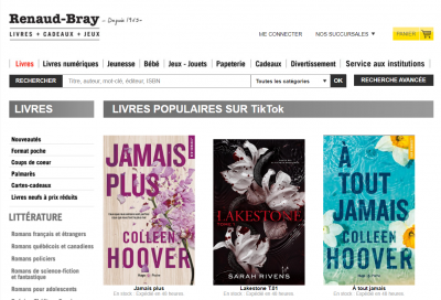 - Section « livres populaires sur TikTok » sur le site de Renaud-Bray, https://www.renaud-bray.com/Livres-tiktok.aspx [Page consultée le 17 mars 2024].