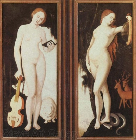 - Description officielle : «Hans Baldung (v. 1484-1545) adopta le surnom de Grien (dérivé de grün, “vert” en allemand) lors de son apprentissage à Nuremberg dans l'atelier de Dürer. Peintre et graveur renommé de la Renaissance allemande, Baldung concevait des compositions complexes dans un style que l'on qualifierait plus tard de maniériste. Baldung produisit une série de retables, de sujets religieux et de portraits privés, mais il peignit aussi, dans la dernière partie de sa carrière, des scènes de sorcellerie. Composées de deux panneaux distincts, les allégories de la Musique et de la Prudence représentent les piliers essentiels de la civilisation sous la forme de deux nus féminins déformés. Avec la précision d'un professionnel habile mais aussi l'intense étrangeté qui émane d'un artiste progressiste, Baldung représente le corps humain d'une manière qui frise le grotesque. Les formes de la chair sont disproportionnées mais élégantes, disjointes mais harmonieuses. Les noirs profonds contrastent avec le jaune pâle et les verts rutilants. Les formes et la posture de la Musique sont féminines, mais son attitude paraît cérébrale et son visage, ses bras et ses mains possèdent un caractère masculin. La Prudence arbore une expression torturée et angélique tandis qu'elle pose le pied sur le serpent de la Tentation, et que son ventre proéminent suggère qu'elle est enceinte. Entre paganisme et christianisme, Baldung représente la psychologie humaine et les valeurs de la civilisation dans un fantastique mélange des genres.» - Sara White Wilson, Les 1001 tableaux qu'il faut avoir vus dans sa vie, p. 161