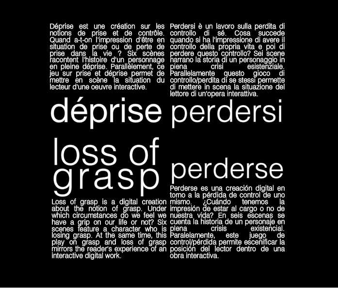 Résumé : Déprise est le premier tome d’une trilogie de fictions web intitulée « Hyper-tensions » écrites par Serge Bouchardon. Réalisée cette fois-ci avec Vincent Volckaert, Déprise est une œuvre, divisée en six parties, qui explore le thème de la perte de contrôle. Nous suivons donc l’histoire d’un narrateur autodiégétique qui peu à peu s’aperçoit que des éléments de sa vie comme la connaissance de ses êtres chers, lui échappent. Il tente alors de « reprendre prise » sur son existence.