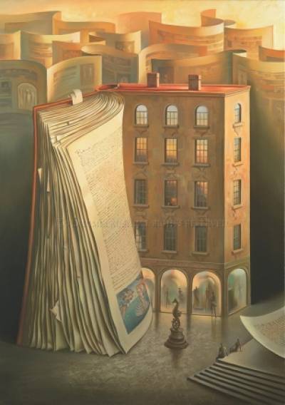 - Description existante: « We live in the present, but our memory retains a whole world connected with the past. Moreover, there is always a sense of wanting to cease the elusive moment that is fading away, so we have to set up a trap for the invisible, resorting to a convention, an image. In the painting we see a giant book next to the solid-looking, presentable New York house built in the 1930-40s or thereabouts. The softness of pages is contrasted with the hardness of granite – analogy could be drawn with regard to the elasticity of brain tissue and toughness of the cranium – that strong box holding the data of the past. Human memory keeps the image of Venus, who was born from the sea font – a well-known metaphor of purity, beauty, infinity and inexhaustible depth. The Birth of Venus was created by Sandro Botticelli five hundred years ago, in 1485. The house takes up only so much space in the city, but human imagination has no limits and translates the images of the past into the framework of the present. It is worth noting how the symbolism of a book is similar to the symbolism of a residential building: as a page consists of parallel lines so an apartment block consists of parallel floors, and individual letters could be linked to individual faces looking out of the windows. »