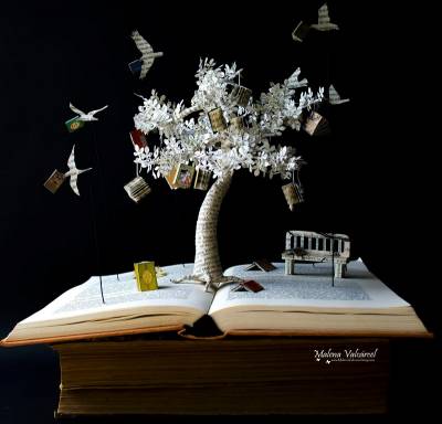 - Description existante : « Spanish artist Malena Valcárcel takes recycled books and gives them new life by transforming them into incredibly intricate book sculptures, jewelry, and other trinkets. Growing up in the Canary Islands, Malena has always been drawn to the beauty of the world, from its trees and clouds to its houses and butterflies. She is fascinated by the way beauty can be found anywhere, and aims to reproduce that in her art. Having never received formal training, she began experimenting with the art of paper a few years ago. Since, her talents have clearly blossomed. As she continues to grow her skills, she never ceases to be amazed by what can be created by simply cutting and shaping paper. Malena makes many of her book sculptures as well as jewelry pieces and more available on her Etsy shop. Keep up with her latest artwork by following her on Facebook. »
